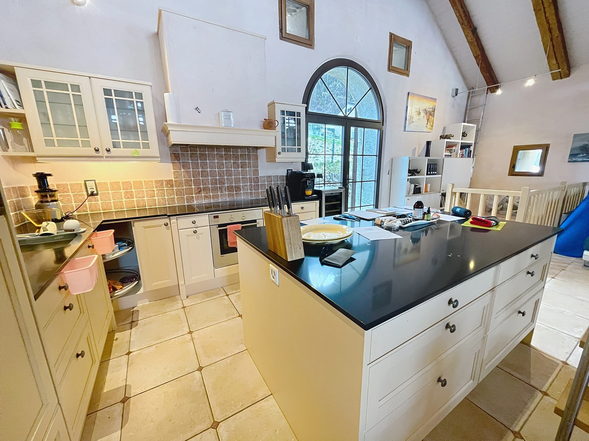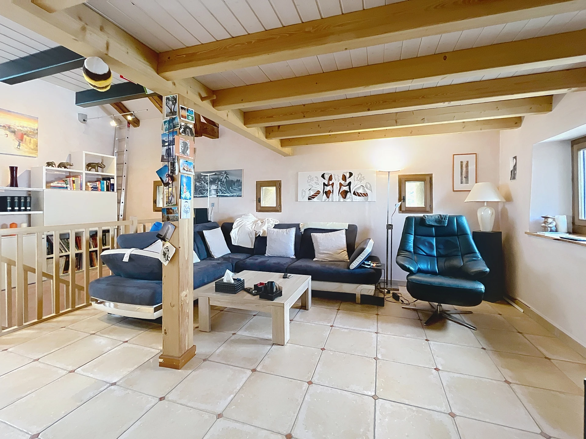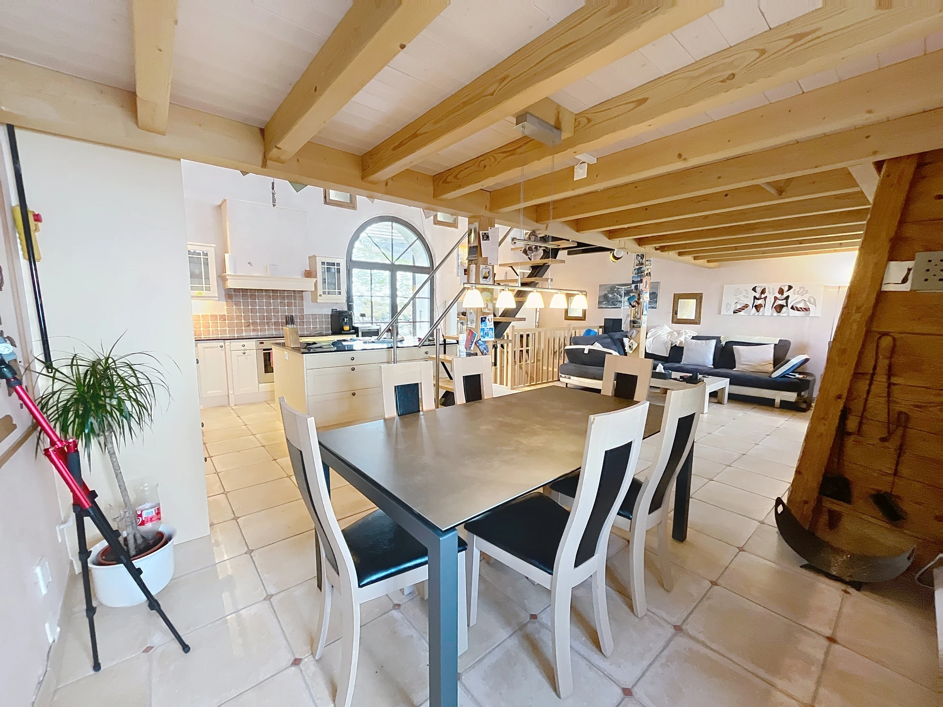 A l'étage, un espace de 55m2 réparti en un séjour avec cheminée, une salle à manger et une cuisine entièrement équipée, accès sur la 2ème terrasse.