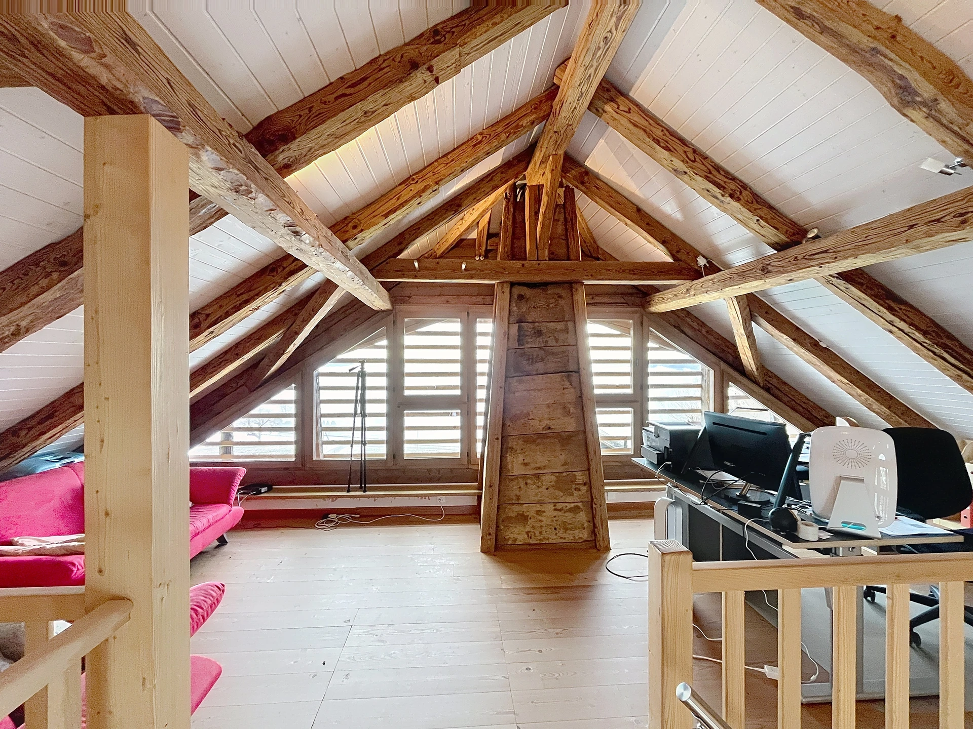 Une belle galerie-mezzanine accessible par une échelle amovible et automatisée fait office de bureau et lounge.