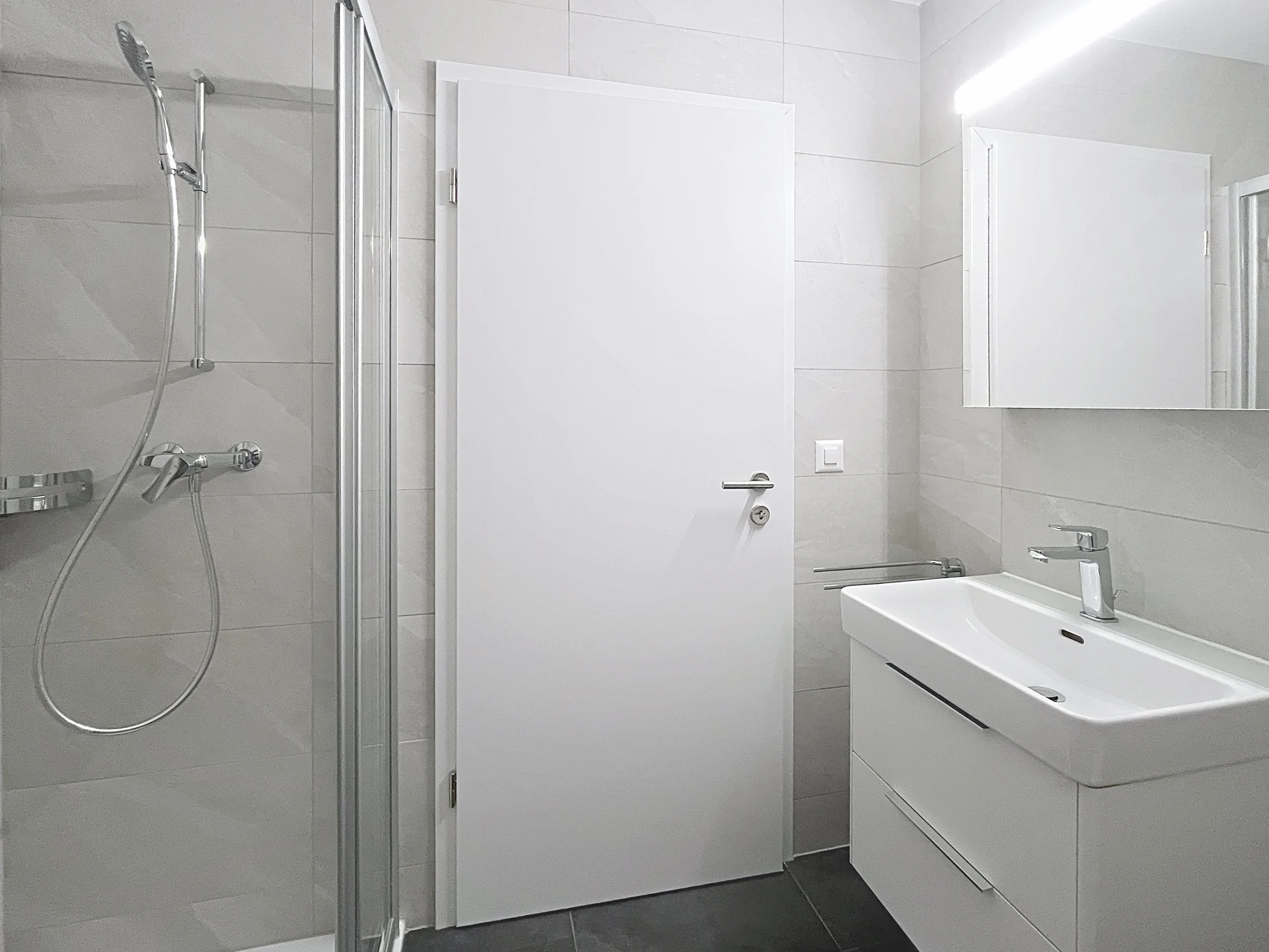 Salle de bain tout confort: revêtement de sol en carrelage, revêtement mural en faïence, équipement complet