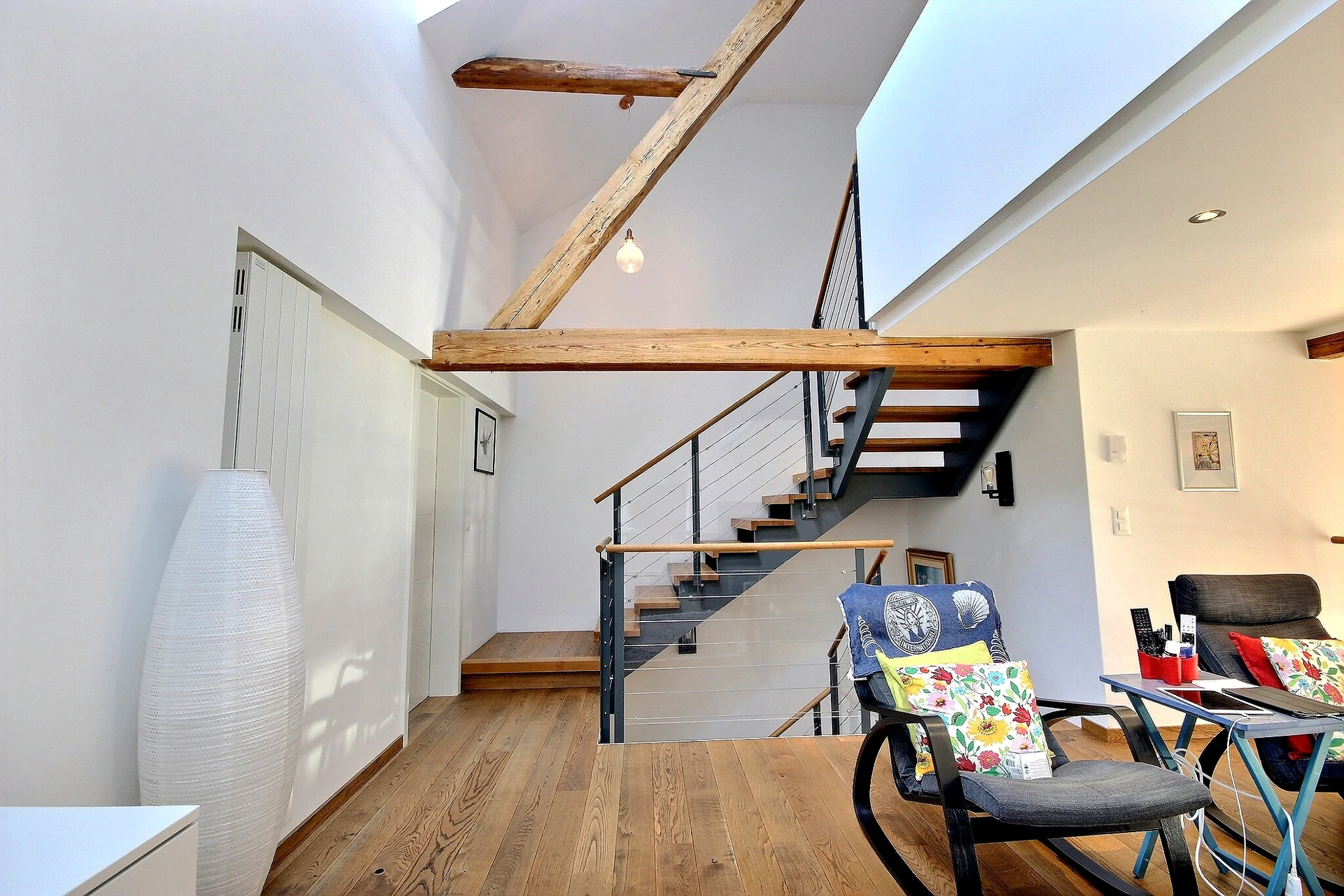 Le premier étage dispose d'une mezzanine de 21m2, surplombant le séjour, offrant un espace privilégié dédié à la détente, à la lecture par exemple, d'une deuxième pièce de 17m2 fermée, actuellement aménagée en bureau, d'une salle d'eau avec wc, douche, lavabo et d'un espace buanderie.